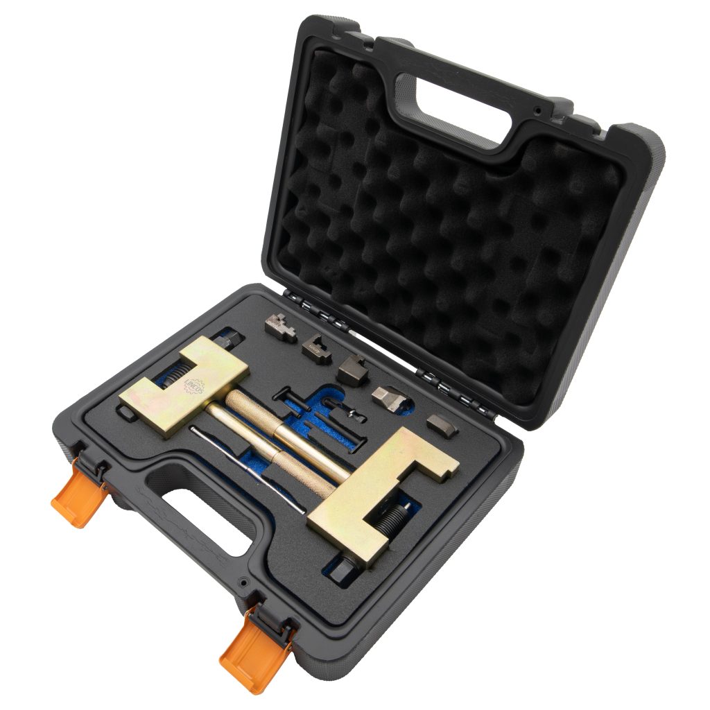 За подмяна и заклепване на вериги за синхронизация. Подходящ за модели на Mercedes с дуплексна верига за синхронизация с 4mm болт за верига. За дизелови двигатели на Mercedes Benz, Chrysler, Jeep с обем от 1.7 до 4.0.