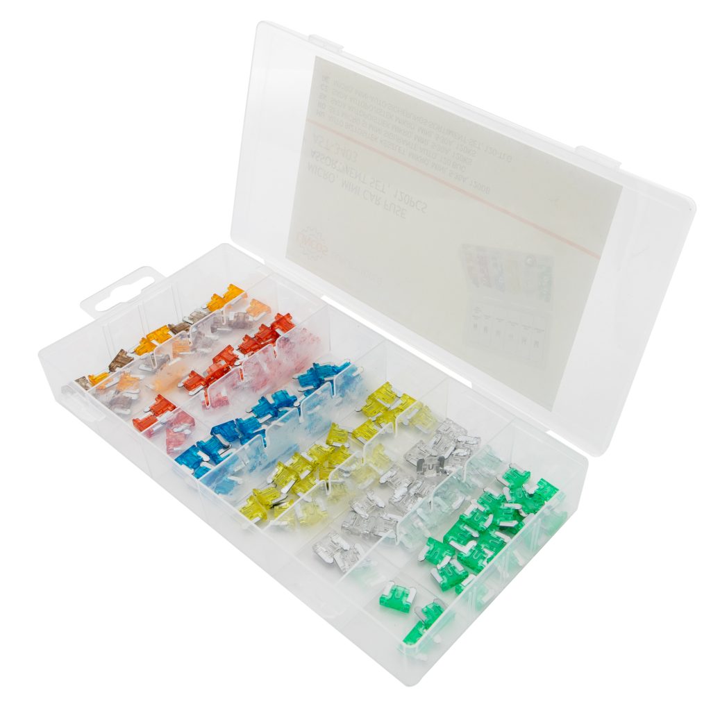 Комплект с 120 броя микрочипови и мини автомобилни предпазители, включващ шест различни амперажни стойности от 5A до 30A. Цветово кодирани за лесна идентификация и предоставени в организирана кутия за съхранение.
