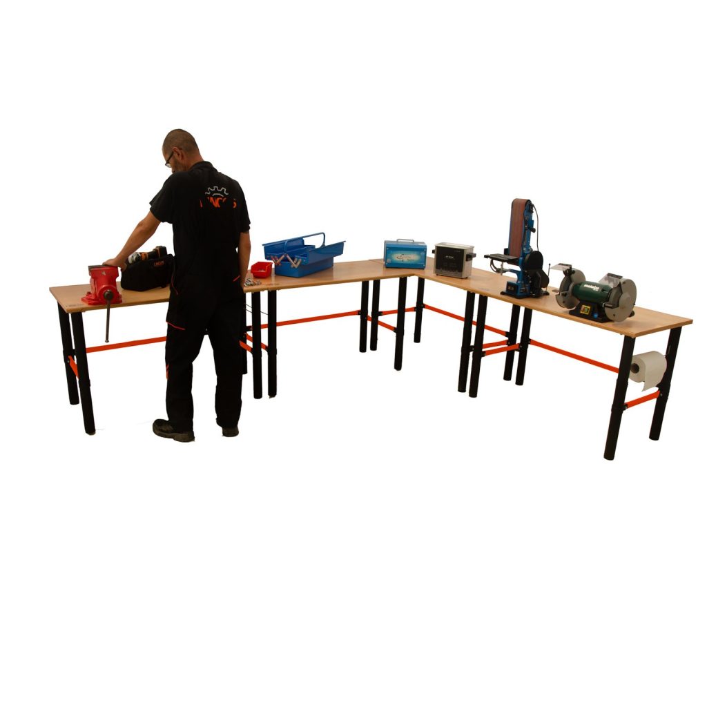 Стабилни метални крака, които са индивидуално регулируеми, създавайки напълно хоризонтална работна повърхност на неравни повърхности. Работната маса може да се сглоби много лесно и бързо (за около десет минути), без да са необходими пробиване или специални инструменти. Нужен ви е само 13mm ключ.