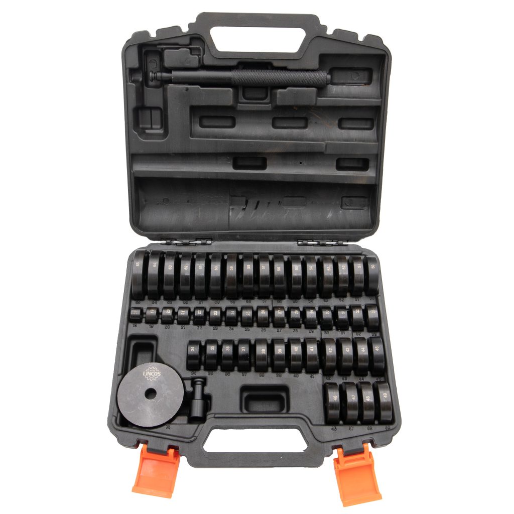 Комплектът включва разнообразие от заключващи вложки за притискане на лагерите на място или за тяхното отстраняване от монтажната им позиция. Използването на правилния размер и тип монтажна плоча е важно, за да се гарантира, че лагерите са инсталирани правилно и остават сигурно на място. Този комплект улеснява и прави по-ефективно инсталирането и отстраняването на лагери.