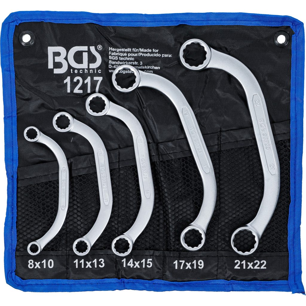 Комплект от 5 броя ключове с пръстен за затруднени места, изработени от хром-ванадиева стомана с матово хромово покритие, съхранявани в тетронова чанта.