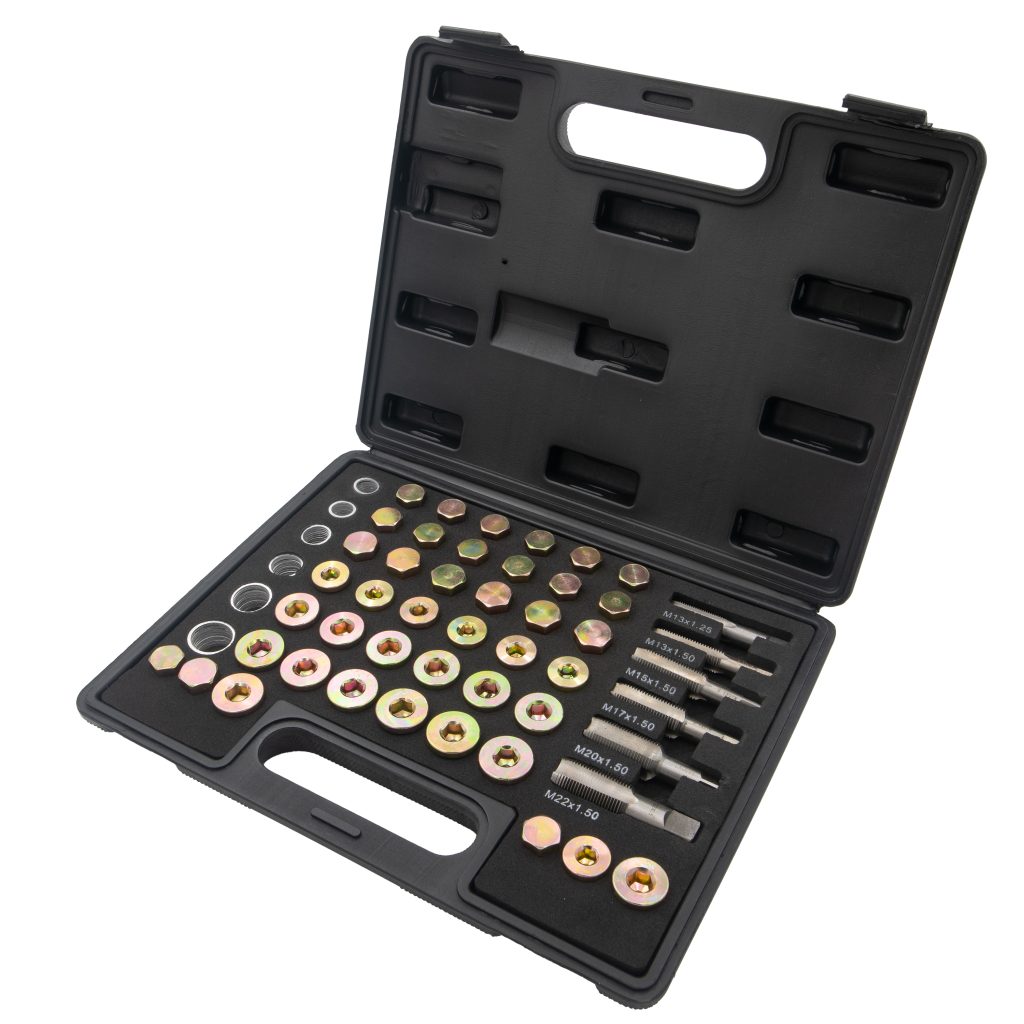 Това е пълен комплект от 120 части, предназначен за ефективен ремонт на повредени или износени резби на пробки за източване на масло. Този всеобхватен комплект включва всичко необходимо за възстановяване на целостта на системите за източване на масло.