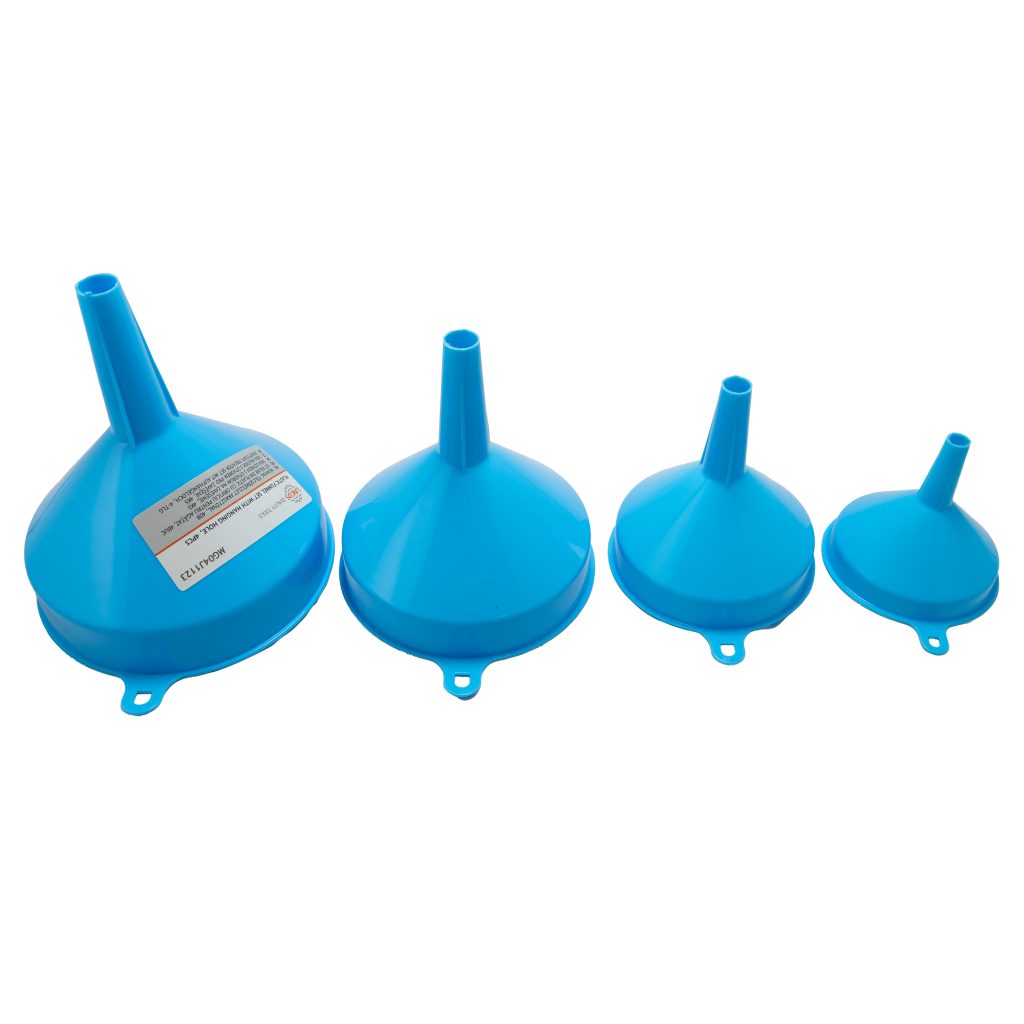 Комплект пластмасови фунии с отвор за окачване, състоящ се от четири фунии с различни размери (80mm, 100mm, 120mm и 140mm). Този комплект е проектиран да улесни наливането на течности, като предотвратява пръскане, разливане и загуба.