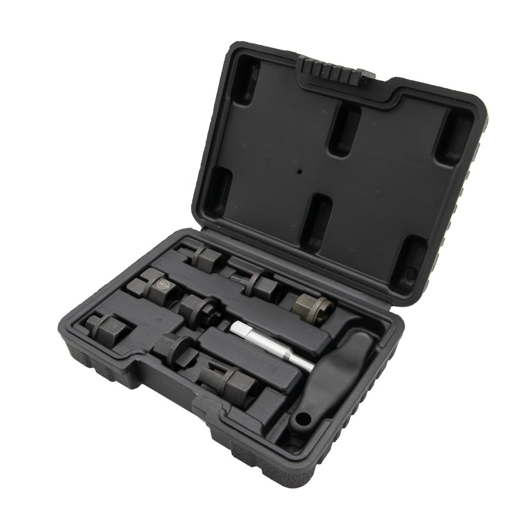 Комплект за монтаж на пластмасови пробки за източване на масло с 9 части. Адаптерите гарантират, че пробките няма да бъдат повредени и улесняват лесното им отстраняване.