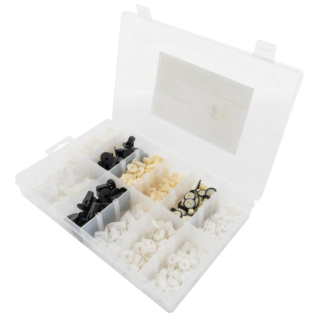 Този универсален комплект от пластмасови винтове и гайки е основен комплект за автомобилни ремонти и възстановявания, осигурявайки сигурно, професионално качество на закрепване на обшивка в всяко автомобилно приложение.