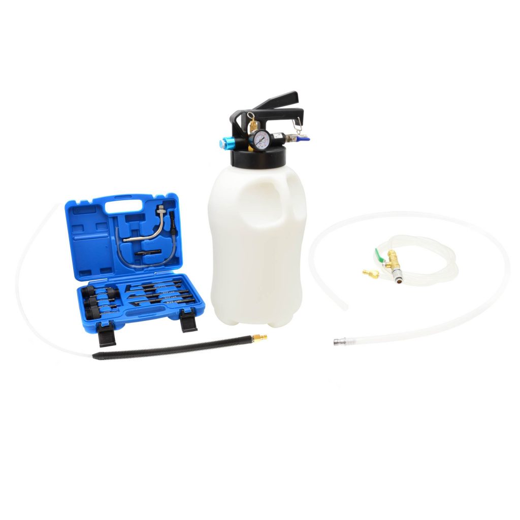 Пневматичен пълнител за масло на скоростната кутия и диференциала за удобно и безопасно източване и пълнене на трансмисионната течност. Вместимостта на резервоара за течност е 10L, който е оборудван с мащаб и двупосочен клапан. Въздушният маркуч е с дължина 200 см, оборудван с топков клапан и бързосъединител. Комплектът включва и два пълнителни маркуча с бързосъединители и защитен гумен слой. Единият е с размери 8x10mm и дължина 100 см. Другият е с размери 4x6mm и дължина 80 см (работни температури: -40 до 125°C). Комплектът включва адаптери за широк спектър от автоматични трансмисии.