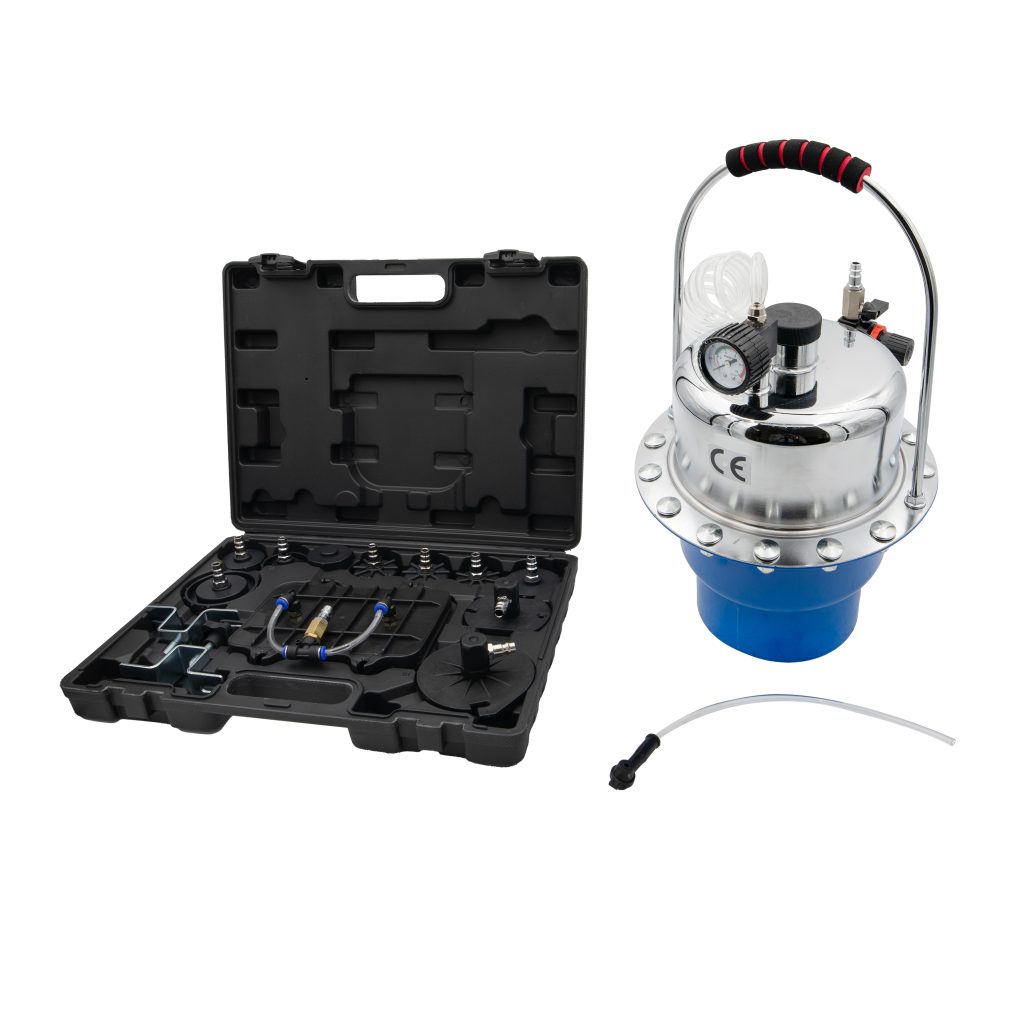 Този комплект за промиване на спирачна система е подходящ за bleeding на спирачни и съединителни системи в превозни средства с ABS система. За работа с машината е необходим само един човек. Подходящ е за лична употреба или в професионален автосерв. Уредът използва стандартно въздушно захранване (10 – 40psi), за да ефективно промие и напълни спирачната система в повечето превозни средства. Резервоарът с ниско налягане може да бъде предварително зареден с компресиран въздух, което прави устройството напълно преносимо. Този комплект за промиване на спирачната система е отличен спестител на време, особено ако редовно обслужвате спирачките.