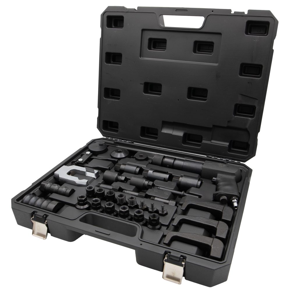 Комплект за изваждане на инжектори с пневматичен чук, 35 части, е специализиран инструментариум, предназначен за демонтаж на инжектори от автомобилни двигатели с помощта на пневматична сила.