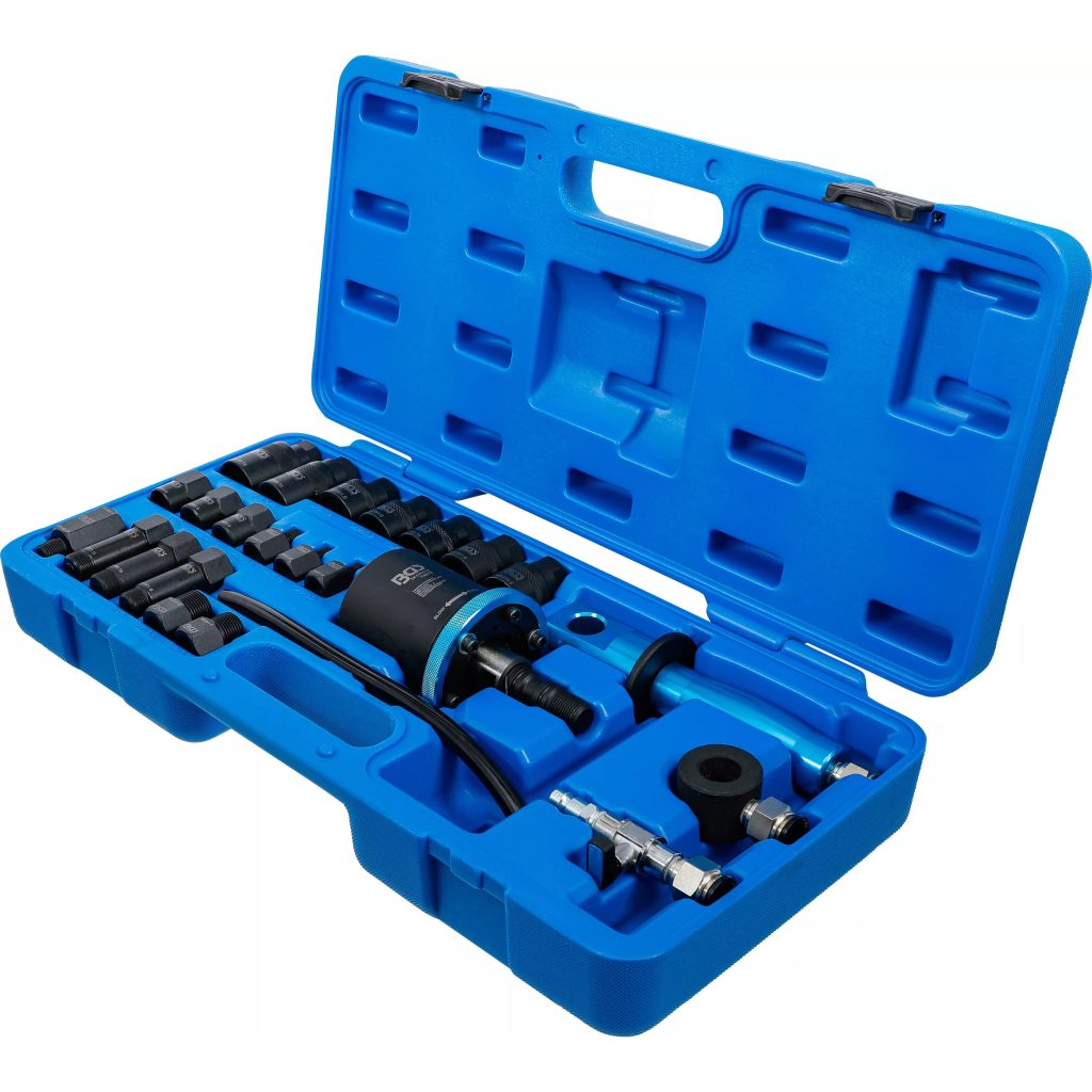 Този пневматичен комплект за извличане на инжектори е мощно решение за премахване на стегнати или засядали дизелови инжектори. Използвайки компресиран въздух, инструментът осигурява висока ударна сила, за да освободи инжектори, засегнати от кокс и ръжда. Извличащият уред се завива директно в инжектора с помощта на един от многото включени адаптери, осигурявайки сигурен и ефективен процес на премахване.
