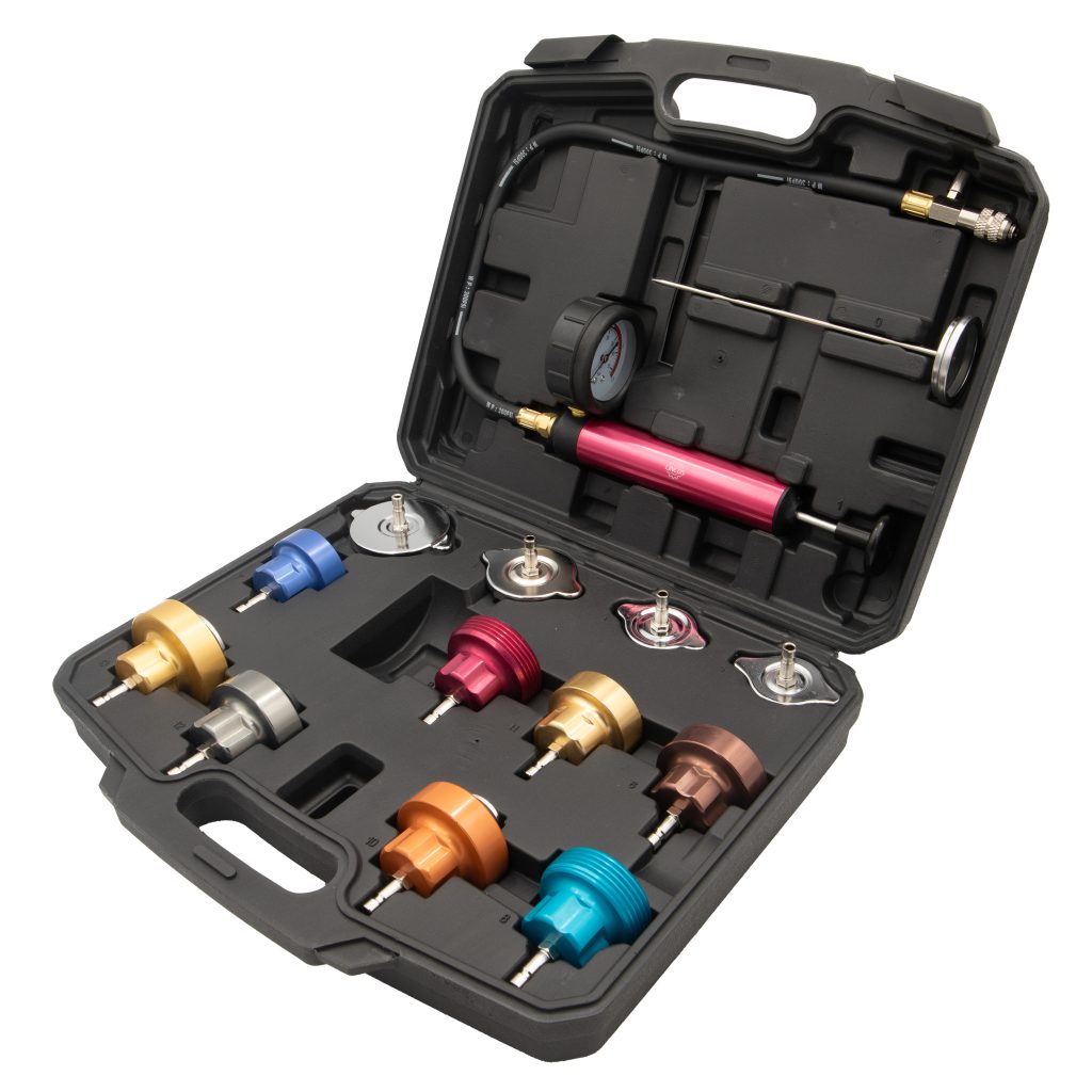 - Комплект за тестване на налягането и течовете на радиатора, подходящ за почти всички типове автомобили