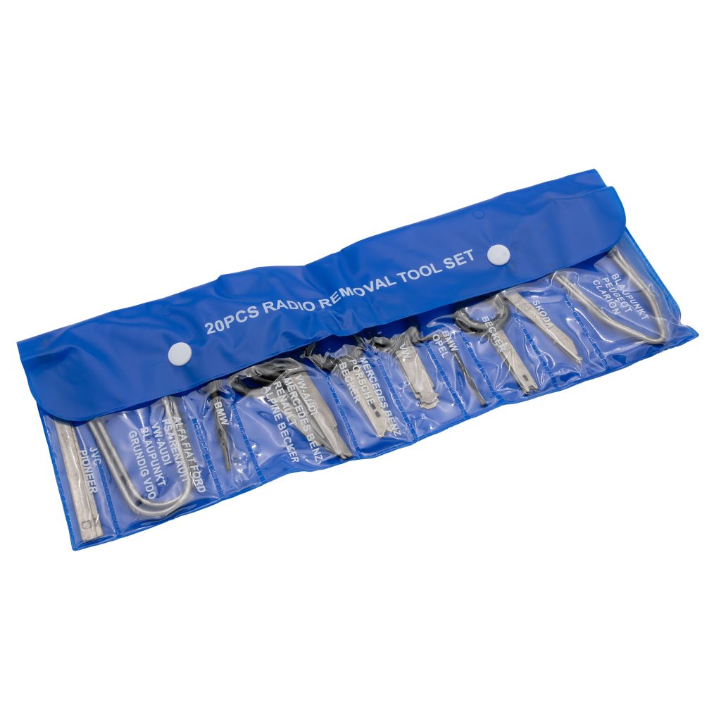Комплектът включва набор от ключове и куки за сваляне на радиа, всеки от които е специално проектиран да пасва на различни типове отвори за радиа или механизми за освобождаване. Тези инструменти ви позволяват да освободите клиповете или заключващите механизми, които държат радиото на място, без да повредите таблото или околната облицовка.