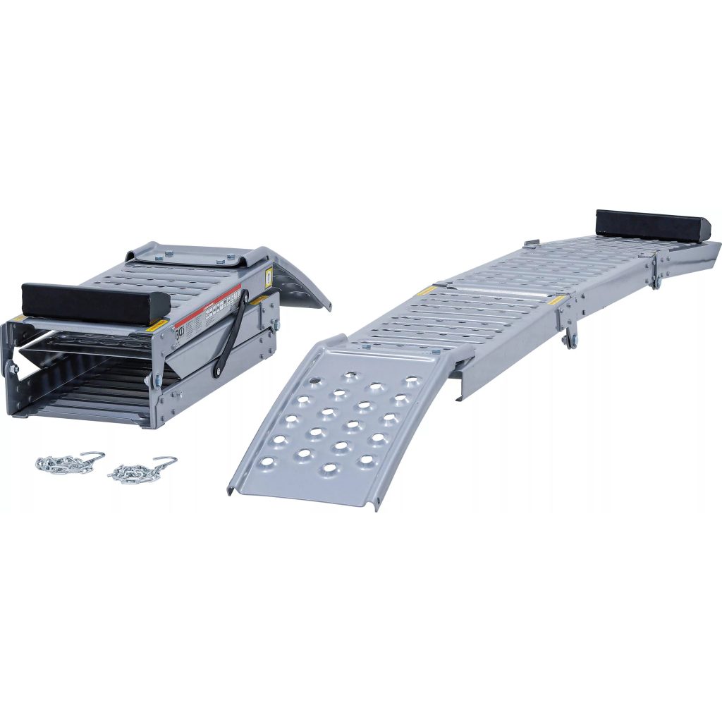 Комплектът сгъваеми рампи 2 броя е многофункционално и мобилно решение за безопасно и ефективно товарене и разтоварване на четириколки, мотоциклети, косачки и подобни превозни средства. Благодарение на сгъваемия дизайн, рампите са компактни и лесни за транспортиране, оборудвани с дръжки за носене за удобно манипулиране.