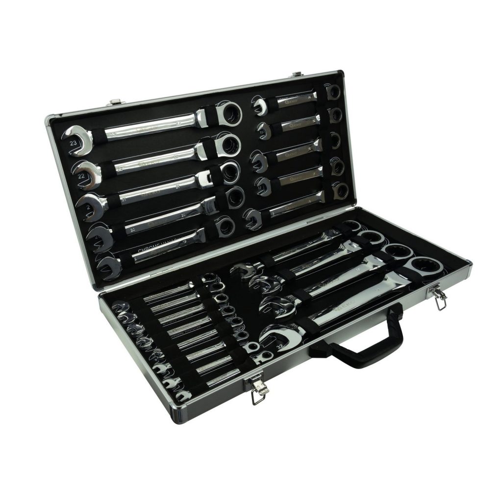 Комплект комбинирани ключове с гъвкава глава 6-32mm, 22бр. 12-точковият ръчков край изисква само 5 градуса, за да завърти болтовете. Размери: 6, 7, 8, 9, 10, 11, 12, 13, 14, 15, 16, 17, 18, 19, 20, 21, 22, 23, 24, 27, 30, 32mm.
