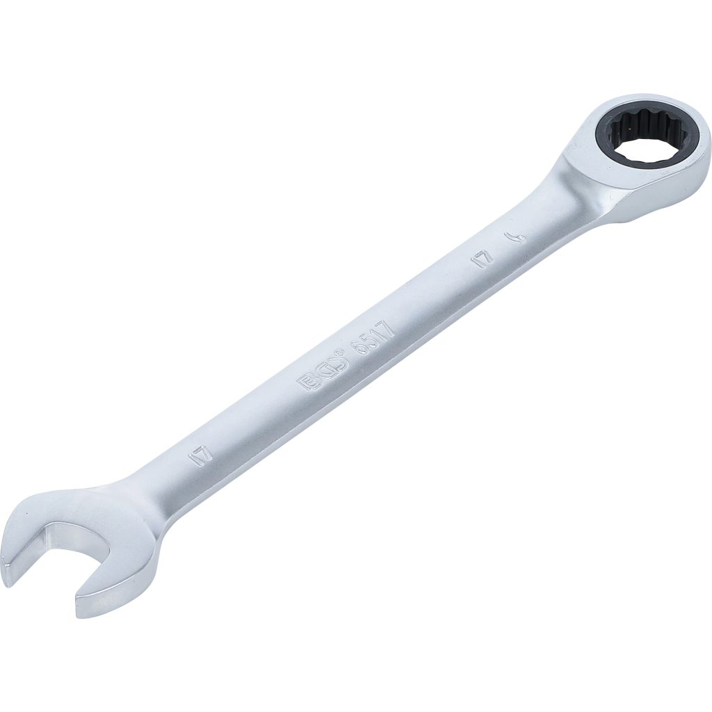 17mm комбиниран ключ с 72-зъбен реверсивен механизъм, 12-точков профил, сатенен хромов завършек.