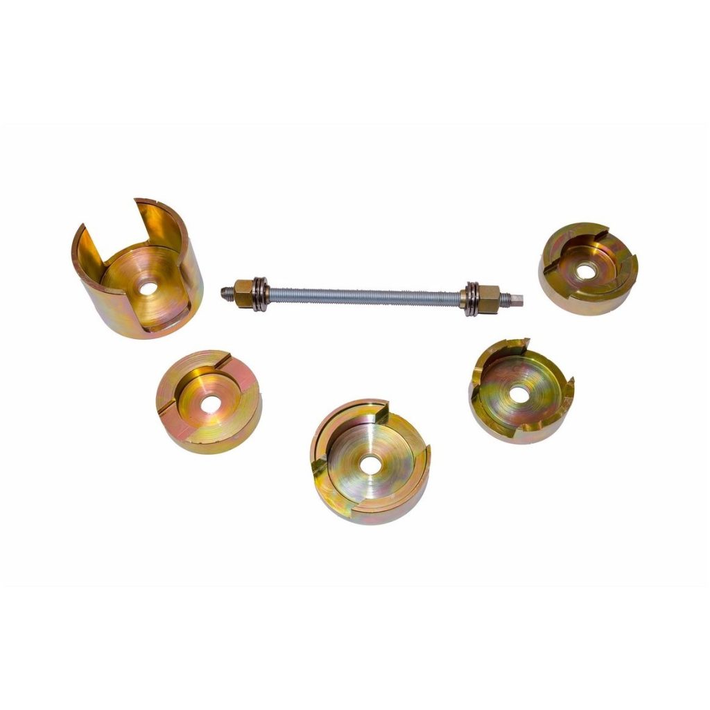 - Комплектът включва 5 адаптера, което позволява съвместимост както с оригинални, така и с резервни втулки, обхващайки всички версии на втулките преди и след модификация.