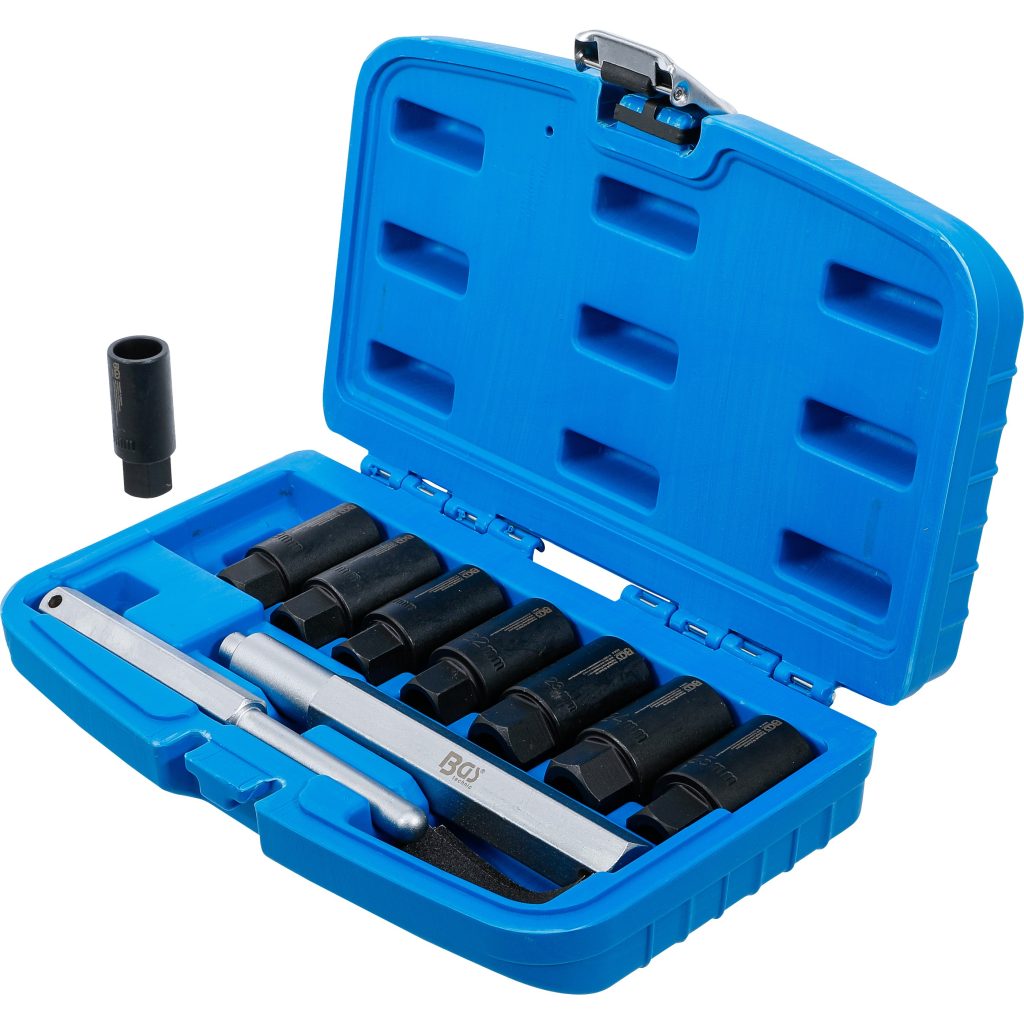 Комплектът за демонтаж на заключващи гайки позволява бързо и без повреди сваляне на заключващите гайки. Включва 8 конусни накрайника за демонтаж и 2 мандрела за сваляне, подходящи за почти всички стандартни размери заключващи гайки.