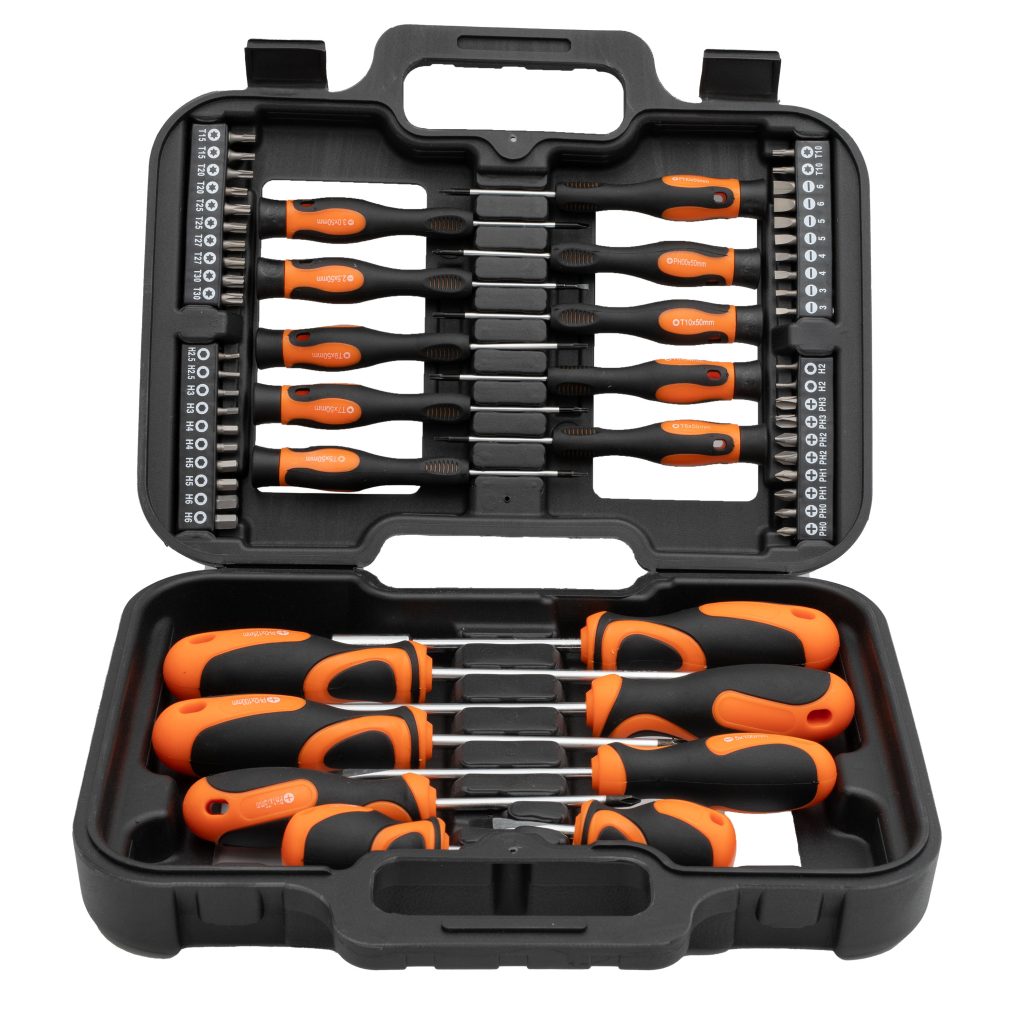 Комплект от 58 части отвертки, прецизни отвертки и битове в практична пластмасова кутия. Изработен от хром ванадий.