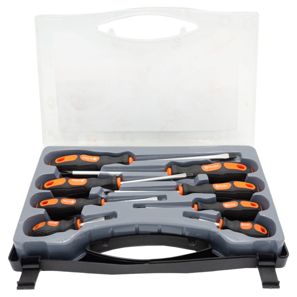 Комплект отвертки с 8 различни размери с кръстата и права глава. Изработени от стомана с нехлъзгаща се пластмасова дръжка. Дръжките имат отвори за лесно съхранение. Доставят се в кутия за съхранение.