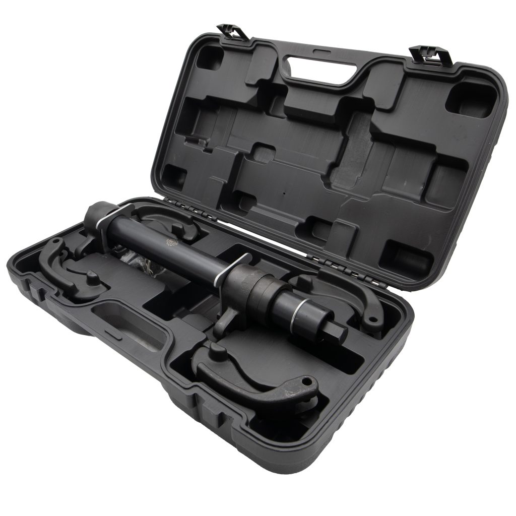 Специално проектиран за демонтаж и монтаж на пружини на окачване тип Макферсън на предните и задните оси на много различни автомобили. Има здрава, защитена винтова конструкция за оптимална здравина и безопасност. Напълно регулируем и много сигурен. Универсалните подвижни рамена (обхват 100-265 мм) пасват на почти всеки автомобил. Специалната форма на рамената предотвратява движението на пружината. Здрав инструмент, който може да се използва и с ударен гайковерт.