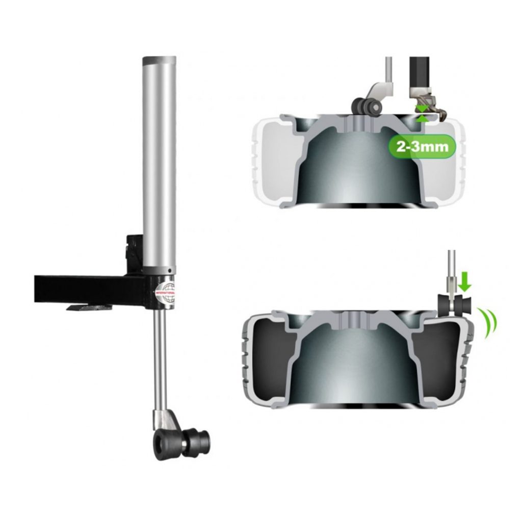 - Притиснете натискващия ролер зад монтажната/демонтажната глава, като оставите 2-3 мм разстояние между монтажната/демонтажната глава и джантата на гумата, за да предотвратите надраскване на джантата от монтажната/демонтажната глава.
