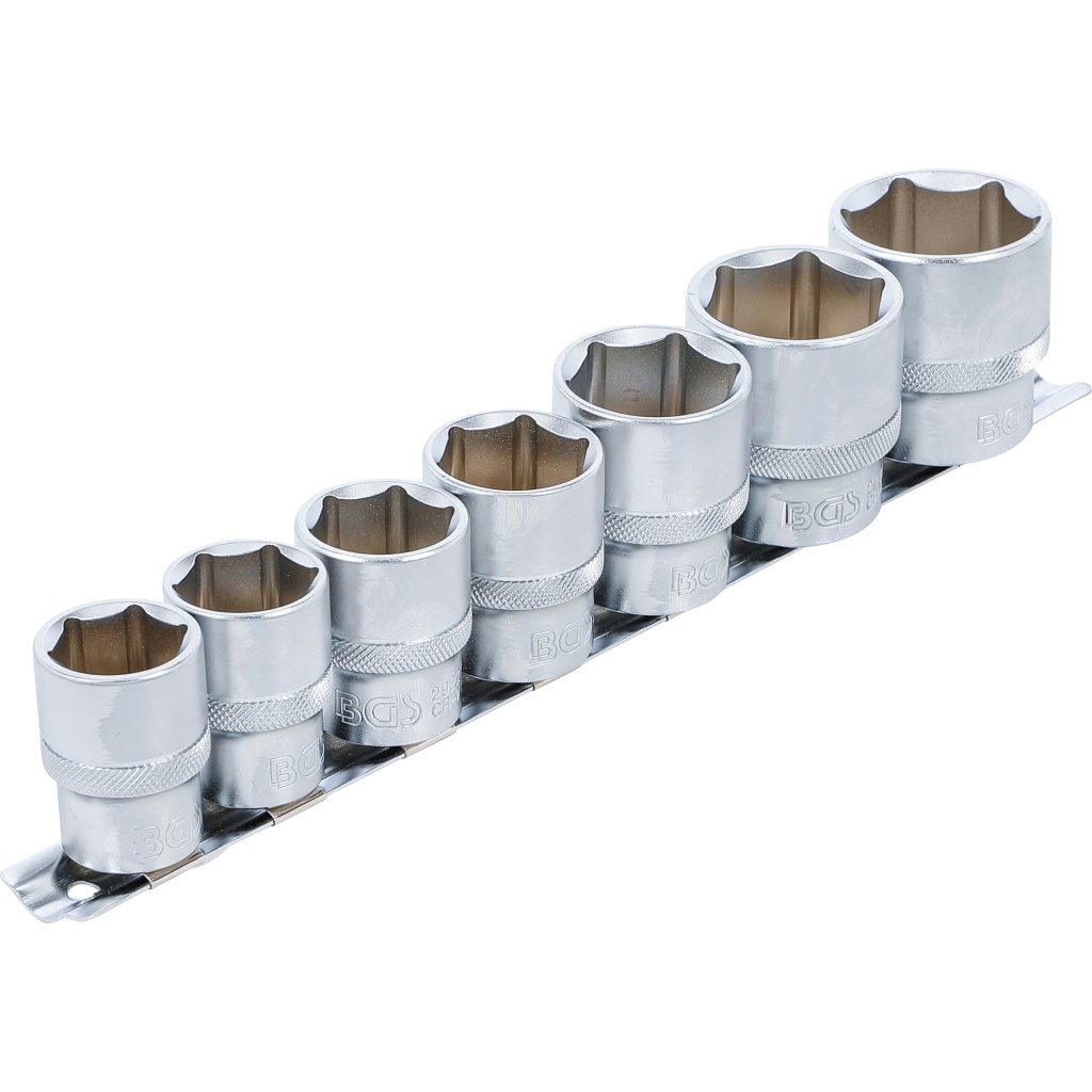 The socket set, hexagon 12.5 mm (1/2″) drive 20-32 mm 7 pcs offers a versatile range of larger hexagon sockets for manual operation. Its knurled design ensures a secure grip during use. All sockets are organized on a socket rail for easy storage and quick access.