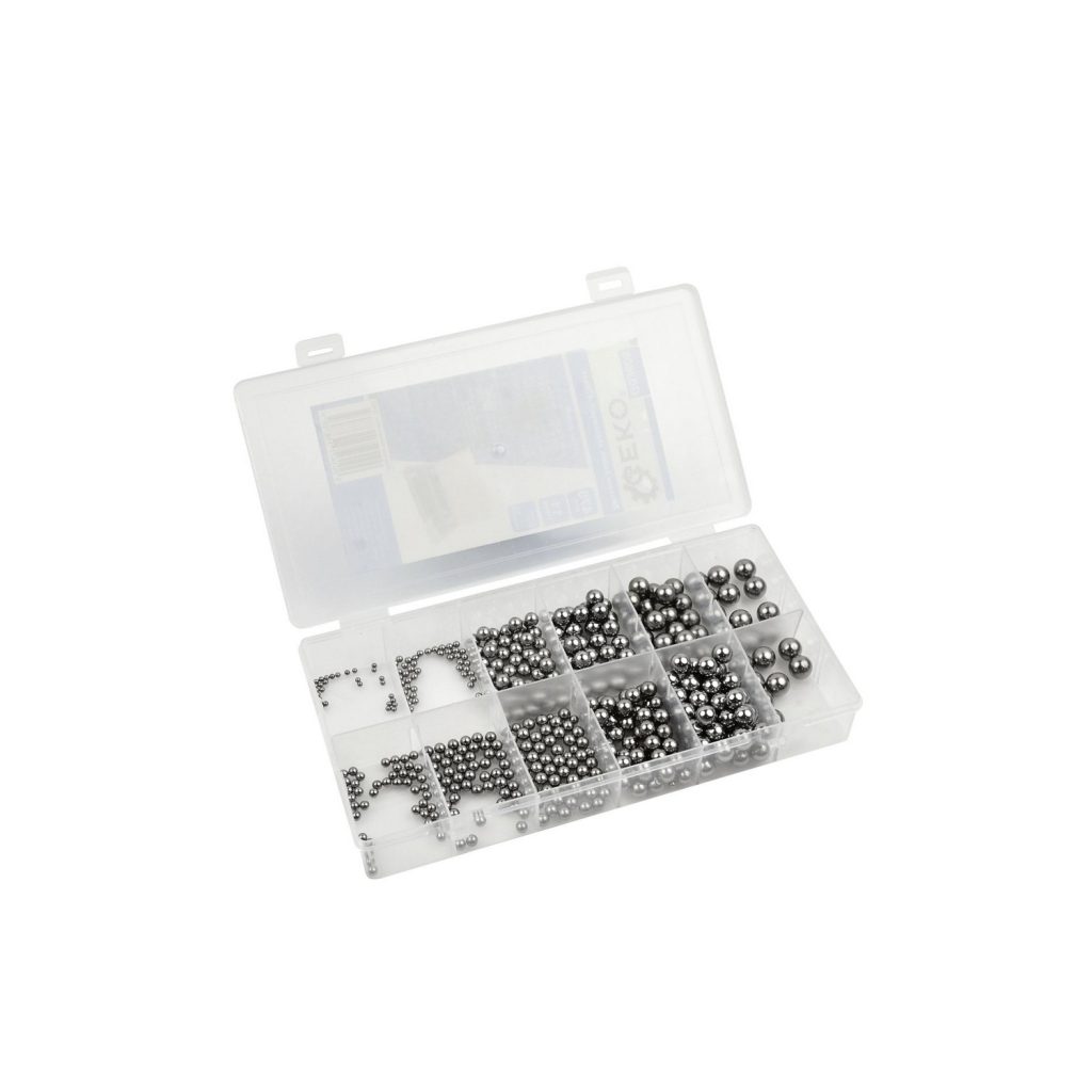 Комплект от 470 броя стоманени лагерни топки в 11 размера. Изработени от висококачествена стомана. Всяка от тях е покрита с малко количество смазка, за да се подобри смазването и да се предотврати корозия и ръжда. С отлична устойчивост на ръжда и корозия, е подходяща за влажни среди.