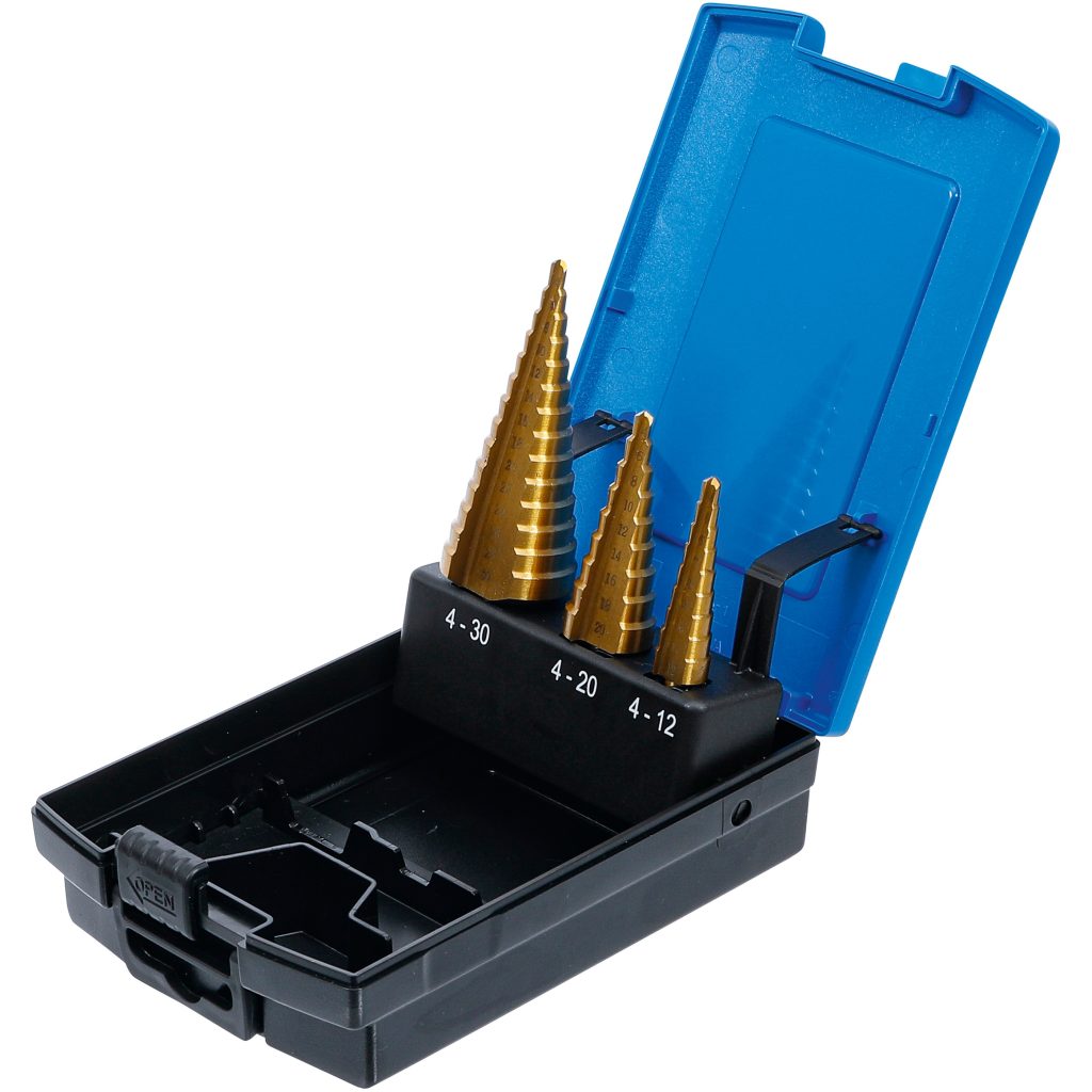 3-piece titanium-nitrided HSS step drill set Ø4-30mm, 2mm step increments.
