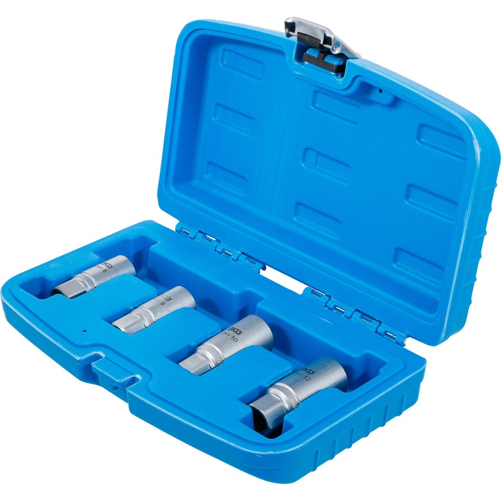 Този комплект за екстракция на шпилки, 4 бр. е издръжливо и ефективно решение за премахване на счупени или заклинили шпилки в широк спектър от приложения. Проектирани за използване с 12.5mm (1/2″) задвижване, тези инструменти осигуряват здраво захващане на шпилката, позволявайки сигурно и безповредно отстраняване.