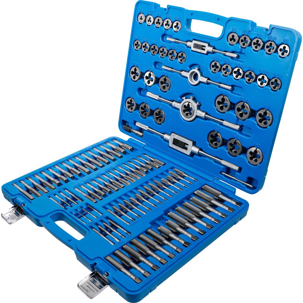 Комплект метчици и плашки за фини резби, съдържащ 110 части. Включва държачи, стартови и проходни метчици, както и плашки от M2 до M18.