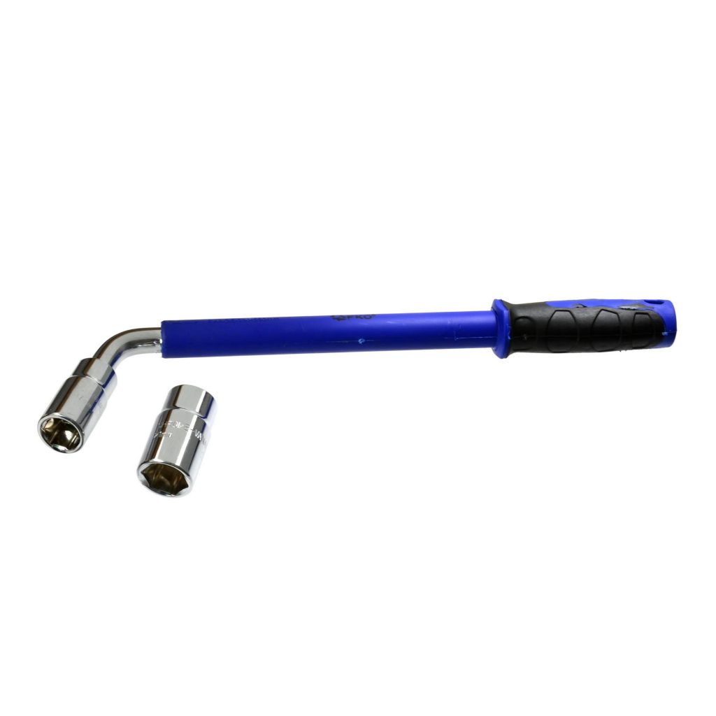 Укрепен, разтегателен L-образен ключ за колела. Телескопичният дизайн позволява удължаване на лоста до 550mm. Ключът е изцяло изработен от хром-ванадиева стомана (CrV), което го прави изключително издръжлив. Неплъзгащата се дръжка осигурява удобен и сигурен захват по време на работа. Позволява бързо развиване или завиване на болтовете на колелата. Ключът идва с накрайници 17x19mm и 21x23mm, изработени от висококачествена CrV стомана.