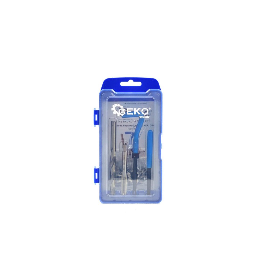Комплект за ремонт на повредени резби M8x1.25mm. Комплектът включва свредло и тапка, изработени от висококачествена HSS4341 стомана с висока скорост, мандрел за вмъкване, ударен щифт и комплект спирални вмъквания.