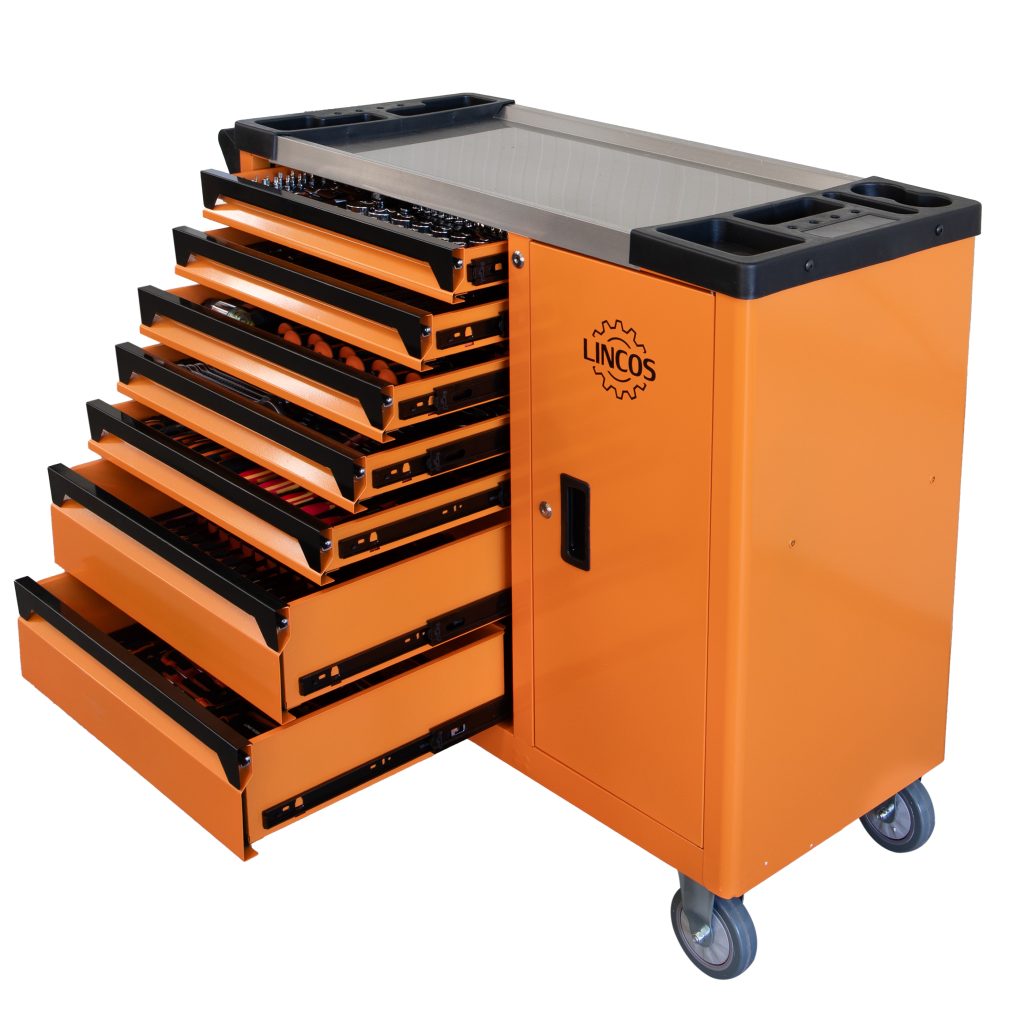 Този шкаф за инструменти с 7 чекмеджета е проектиран за професионални потребители, търсещи надеждно и пълно решение за инструменти. Включва 407-частен комплект инструменти, организиран по функции за максимална ефективност. Шкафът разполага с две фиксирани и две въртящи се колела с спирачки, което го прави лесен за маневриране и сигурно заключване на място. Всяко чекмедже е с меко затваряне, за да предотврати внезапно затваряне и да осигури плавна работа.