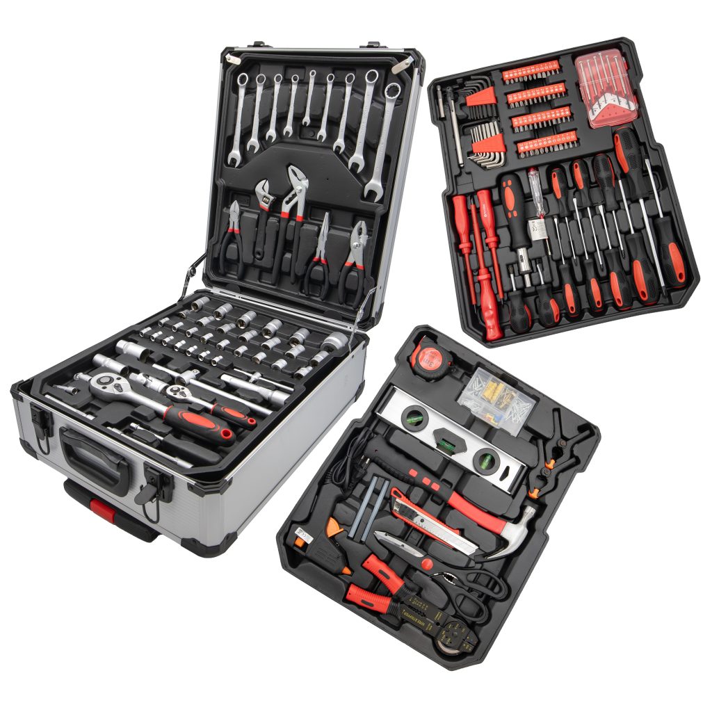187-частен комплект инструменти в заключваща се, подвижна алуминиева кутия с 4 подвижни trays за съхранение на инструменти