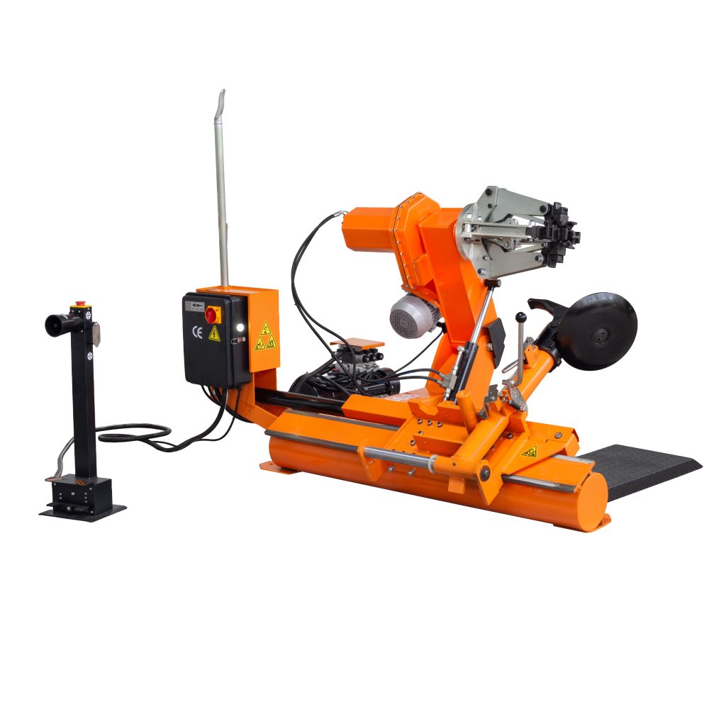 Електро-хидравлична машина за монтаж/демонтаж на гуми на камиони, с ръчно регулируемо люлеещо рамо, подемното рамо/демонтажният блок може да се заключва в две точки, макс. диаметър на колелото 1600 мм, макс. ширина на колелото 780 мм, капацитет за захващане на джанти 14"-26", инструментите са разположени на преносима стойка.