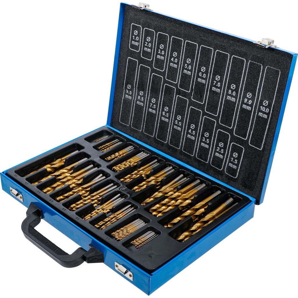 170-piece HSS titanium-nitrided twist drill set 1-10mm, rolled with ground edges, in metal case.