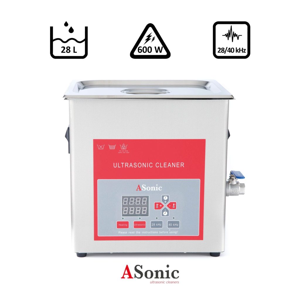 Професионална ултразвукова вана с капацитет от 28 литра, идеална за почистване на големи индустриални предмети и честа употреба. С ултразвукова честота от 28 kHz и 40 kHz и мощност от 600 W осигурява цялостно и бързо почистване.