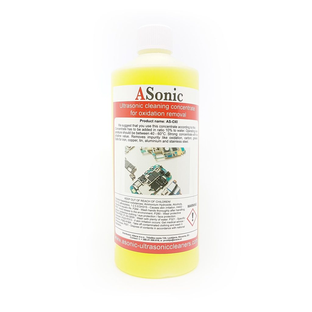 Този почистващ концентрат е специално формулиран за почистване на оксиди, мазнини и въглерод от материали. Окисляването е химическа реакция, която най-често се случва между кислород и друго вещество, като желязо. При почистване на ръждясали окислени материали, AS-OXI е от огромна помощ. Ултразвуковите почистващи концентрати на ASonic са проектирани не само за професионална/индустриална употреба, но и за хоби употреба. Премахва замърсявания като окисляване, въглерод и мазнини.