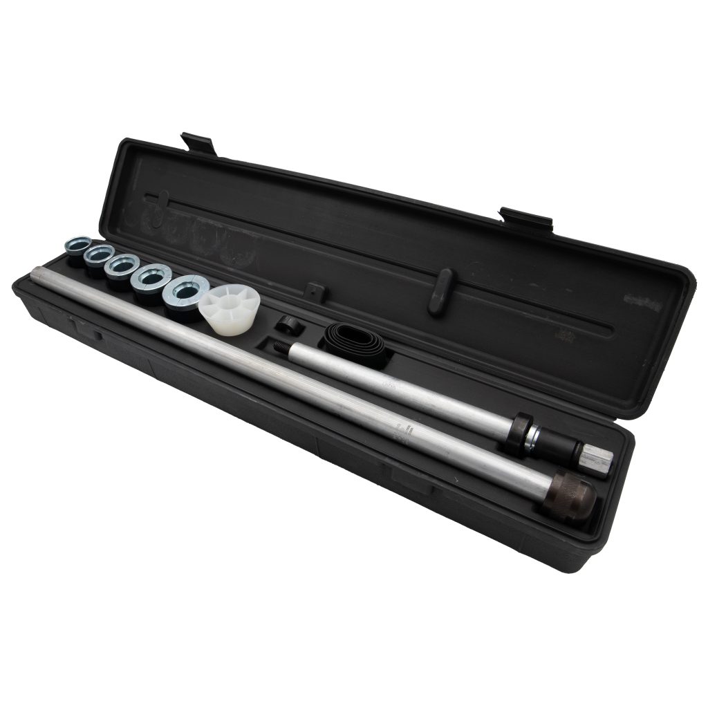 - Този комплект инструменти премахва и поставя лагери на разпределителен вал с размери 1/8″-2/3″ гладко.
