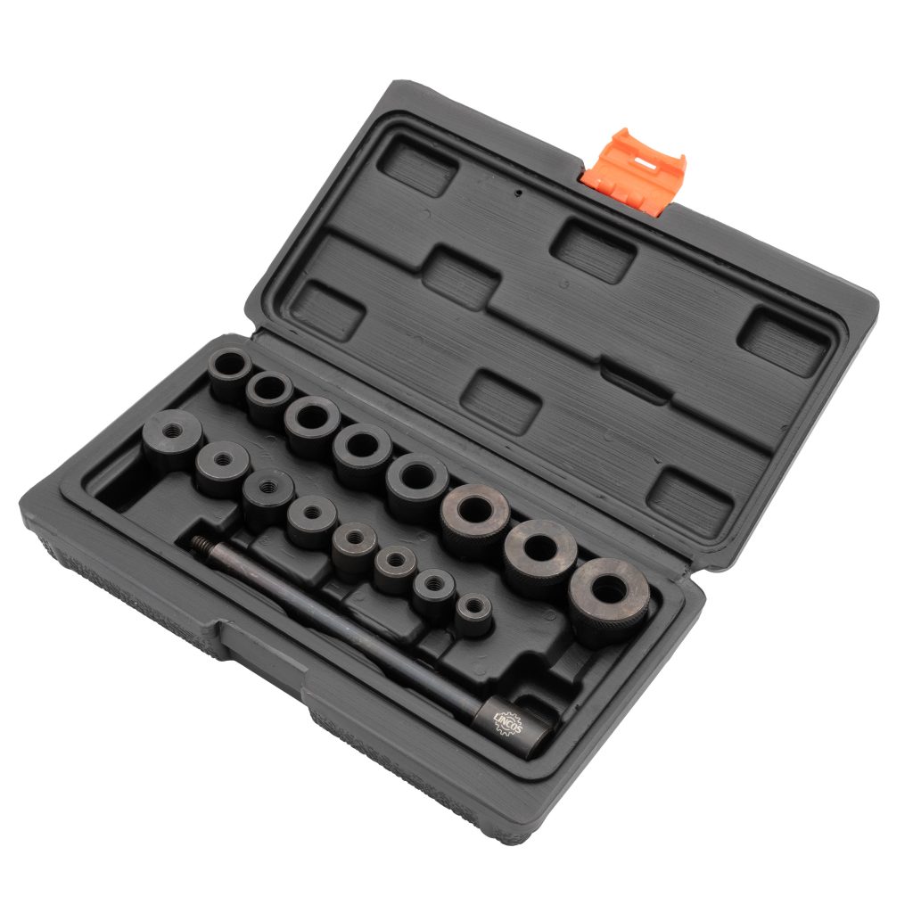 Комплектът за центриране на съединител се използва от автомеханици при демонтаж и монтаж на съединителя. Устройството помага за правилното центриране на диска на съединителя и по този начин предотвратява изкривяване на вала. 16-те конуса с различни размери позволяват комплектът да се използва с почти всички видове и размери съединители. С помощта на комплекта процесът на демонтаж на съединителя ще бъде по-бърз и ефективен, спестявайки време и пари за автомеханиците.