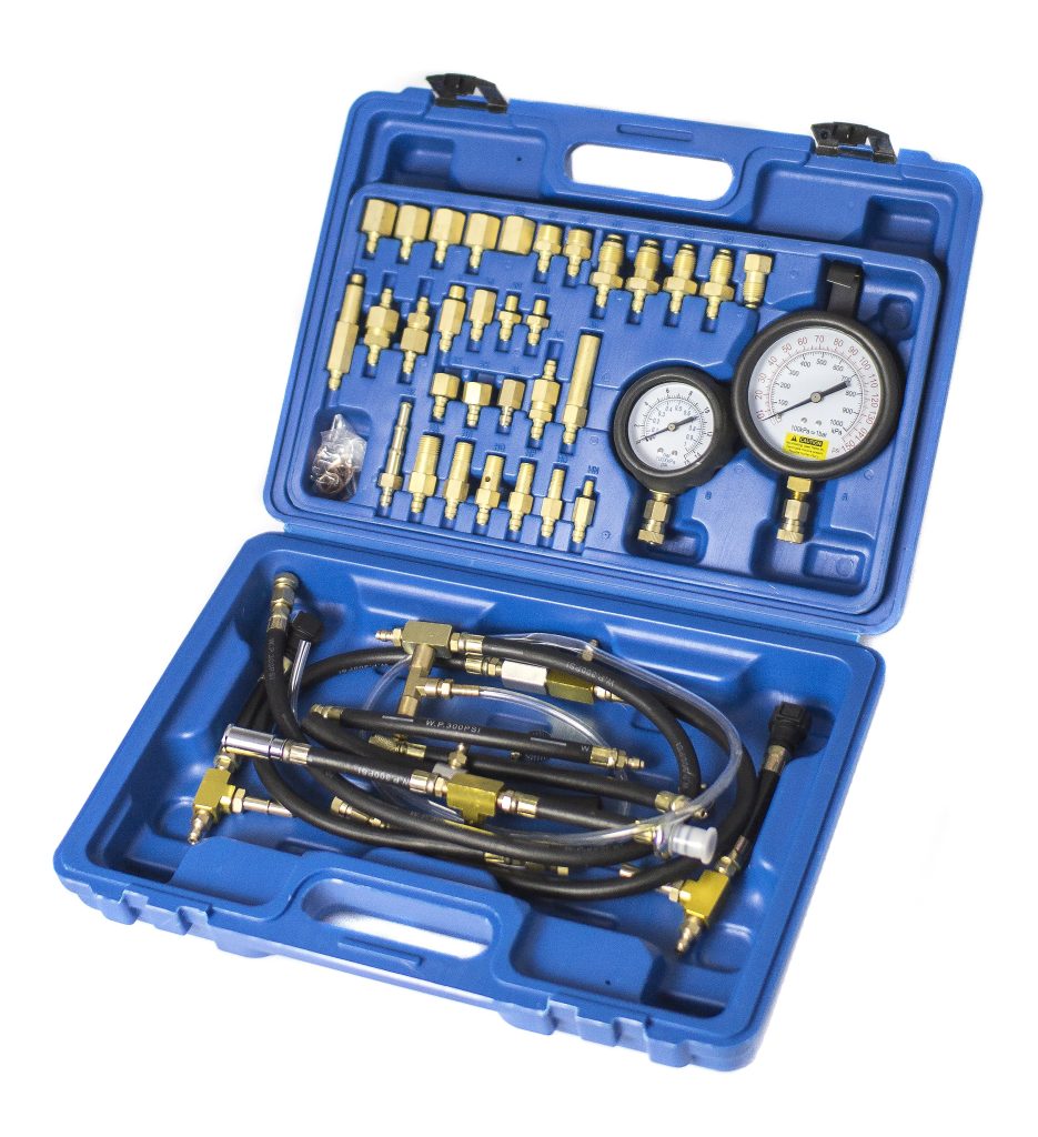 Манометър за високо налягане с два измервателни диапазона 0-145psi и 0-1000kpa. Индикатор за ниско налягане с 0-15psi или 0-100kpa. Поставя се в удобно калъфче, което съдържа и комплект адаптери и маркучи. Адаптерите имат бързи съединения за лесно свързване. Това е универсален измервателен уред за автомобили с бензинови и дизелови двигатели. Може да се използва с всякакъв тип инжектори.