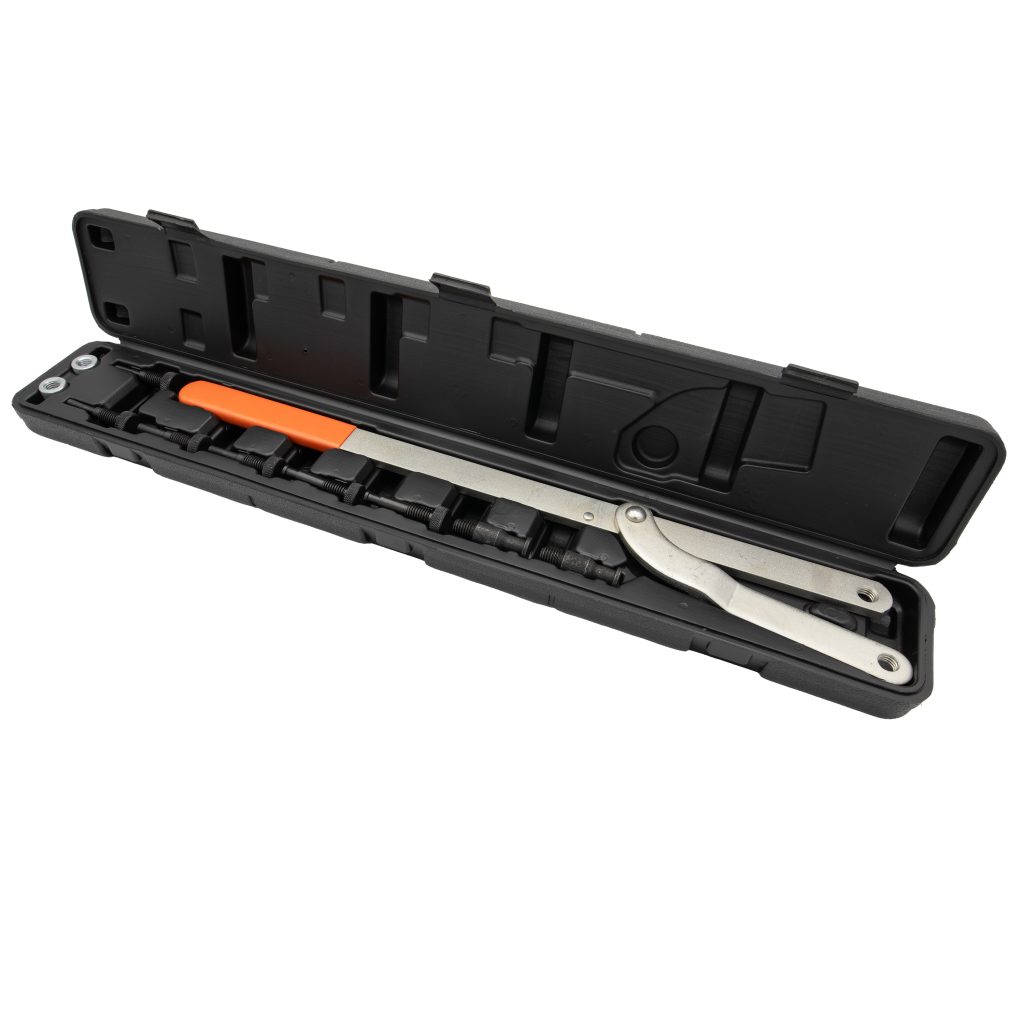 - Сменяеми щифтове: Позволяват използването на комплекта за различни задвижващи шайби и вентилаторни съединители. Това премахва нуждата от закупуване на отделен инструмент за всеки размер и тип.