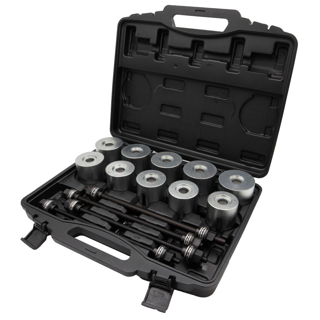 Този универсален комплект съдържа 20 налягания, с 4 спиндела за издърпване с лагерни втулки. Проектиран за автомобилни, лекотоварни и тежкотоварни приложения. Инструментът може да се използва самостоятелно (ръчна работа) или с подходяща вицова маса. Този професионален комплект инструменти е предназначен за демонтаж и монтаж на втулки, безшумни лагери, хидравлични лагери и уплътнения и др.