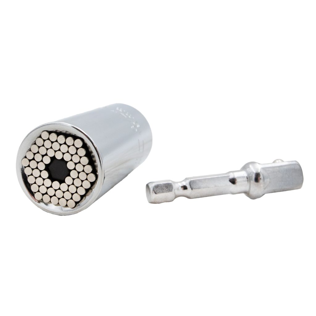 Капачката е оборудвана със специални игли, които се адаптират към формите на главите на винтовете, осигурявайки сигурно захващане. Гнездото може да бъде монтирано на ръчен ключ, а комплектът включва и удължител, който позволява да прикрепите ключа към отвертка или бормашина.