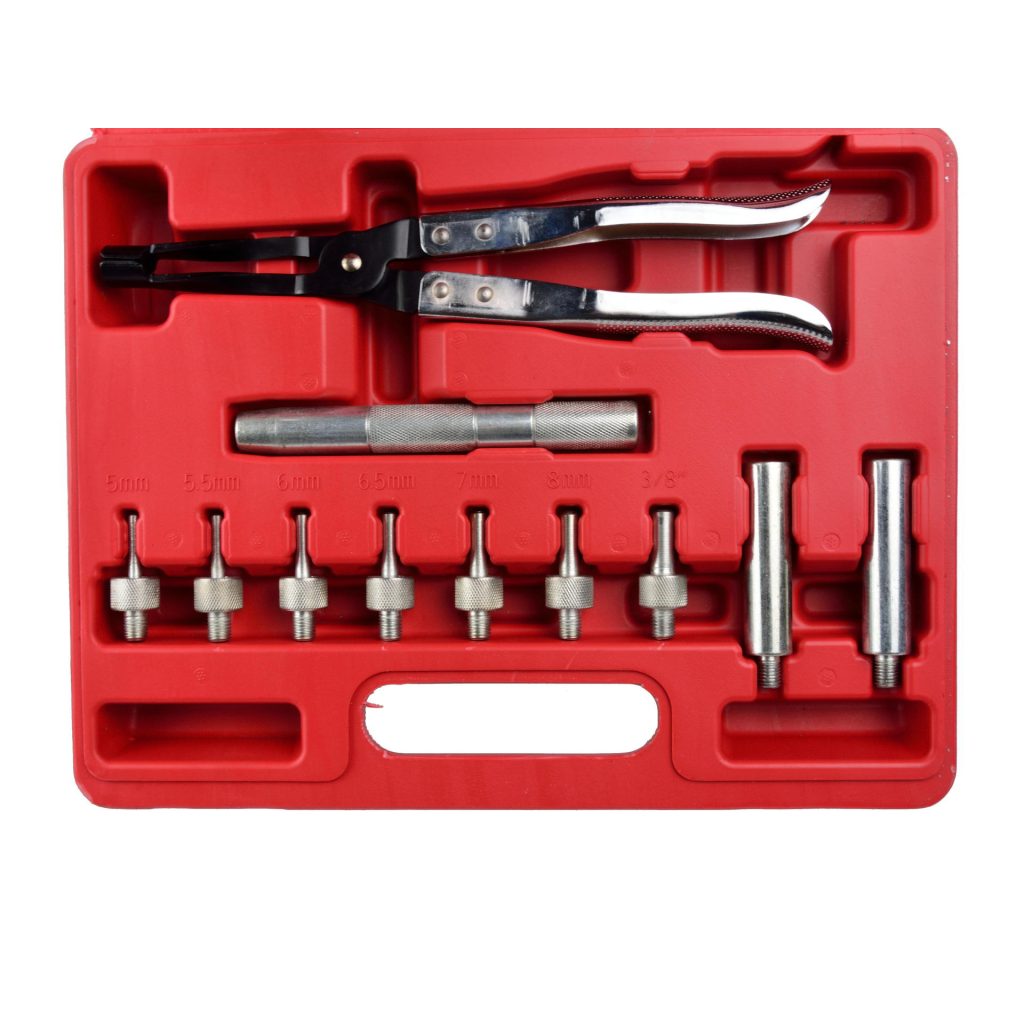 Комплект за сваляне и монтаж на уплътнения на клапани в много клапанни двигатели. Изработен от легирана стомана с антиизносни свойства за допълнителна здравина и дълготрайност. Прецизно обработени адаптери за вкарване на уплътнения напътстват уплътнението за правилно поставяне. Дръжката на клещите е с накатка за допълнително захващане. Клещите за клапани могат да достигнат около стеблото на клапана в ограничените пространства на уплътнението, за да го захванат за сваляне или монтаж.