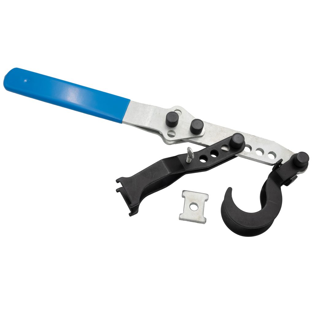Скоба за пружини на клапани компресира пружините на клапаните с болтове на разпределителния вал. Този инструмент може да се използва както с глава, така и без глава на двигателя. Челюстите се регулират, за да паснат на повечето двигатели с горни клапани. Регулируемата дръжка позволява работа в ограничени пространства.