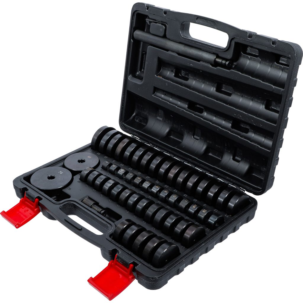 Комплект от 52 части за монтаж на лагерни обвивки, уплътнения и втулки. Ø18–65 mm + 74 mm дискове. Използваем с преса или чук.
