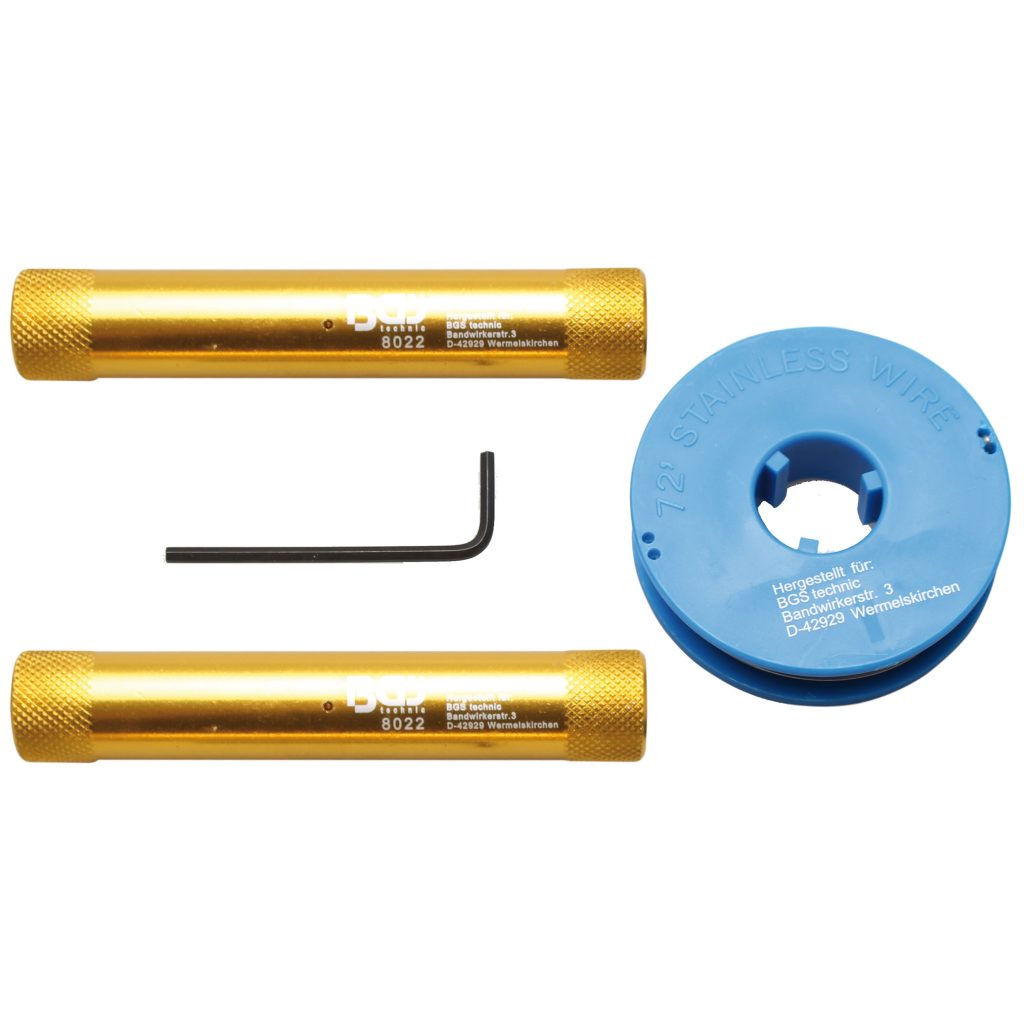 Комплектът за сваляне на предни стъкла Windscreen removal tool set, 4 pcs е проектиран за безопасно и ефективно сваляне на предни стъкла на превозни средства. Той разполага с 22-метров триъгълен профилен нож от неръждаема стомана, осигуряващ остро и ефективно рязане. Двете ергономични дръжки предлагат сигурен захват и контрол по време на рязането, докато включеният вътрешен шестостенен ключ позволява лесно регулиране на напрежението на жицата.